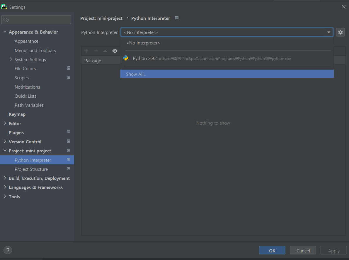 Python Interpreter에 있는 화살표를 누른다음에 가장 하단 Show All을 눌러주세요!!
